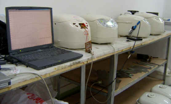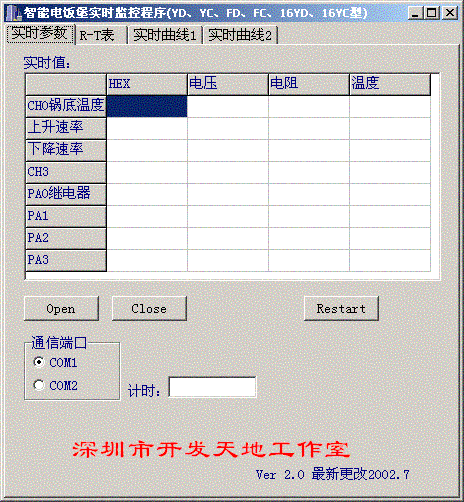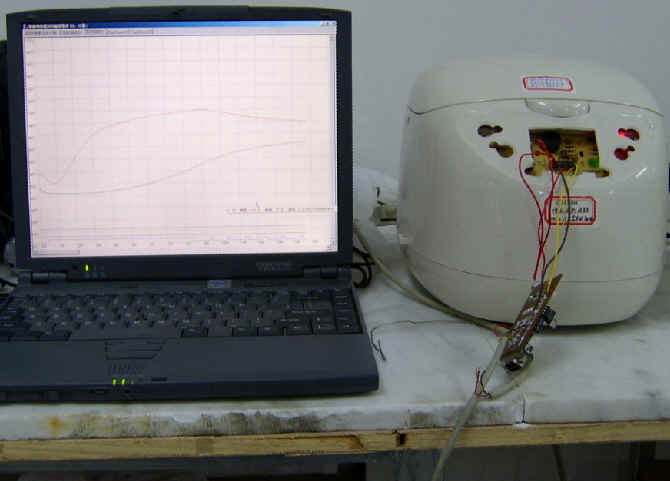 古人讲“工欲善其事,必先利其器”,《电脑电饭煲温度曲线监测仪》是一套电脑电饭煲辅助开发工具,它可以实时监测到电饭煲内温度的变化情况,以及加热与温度的关系,使我们更容易了解电饭煲在各种条件下的工作规律,这些条件包括不同的工作电压、不同的水量、不同的米量、不同品种的大米等,我们在电饭煲的单片机内写入一段监测代码,通过一个I/O口以串行格式输出温度采样的A/D值以及加热继电器的电平变化,送到电脑的RS-232接口,由软件变换为温度曲线绘制出来,在软件中可以测试温度上升速率、曲线可以保存和浏览,有效地提高研发效率和工作进度,同样的方法可以用在如电磁炉等小家电中。我们也真诚希望与各企业单位合作开发类似的工具以用在研发或生产测试中。