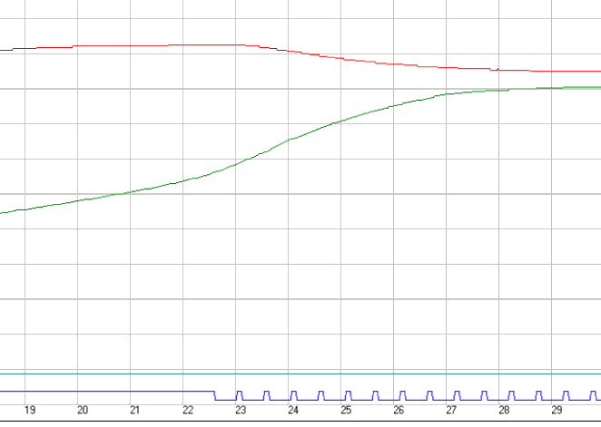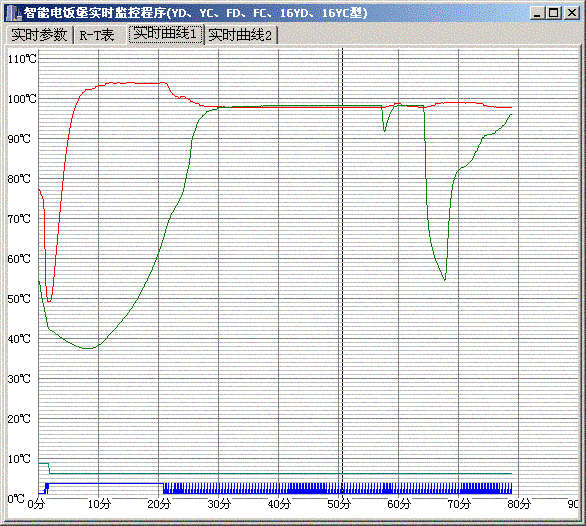 50YD1煮粥曲线图(红色为锅底温度,绿色为锅盖温度,蓝色为继电器加热动作情况)。