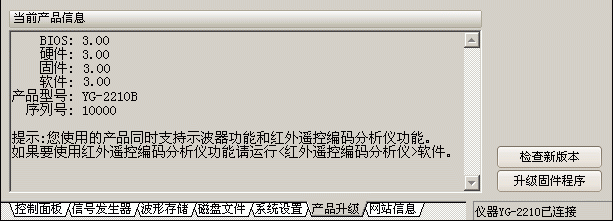 采样深度:支持7种采样深度,采样深度小一点可以提高传输速度,注意设为6.6K时只支持单通道。 曲线类型:点-->绘制波形时,每个样本用一个表示。快速曲线-->绘制波形时,用普通绘图方法把所有样本连起来。平滑曲线-->绘制波形时,用平滑曲线把所有样本连起来,相对快速曲线,这种方法有很好的视觉效果,但速度相对慢一些。 预采样:就是触发点之前的信号也被采样,让我们可以看到触发点之前的信号,一般数字示波器才具有此功能,而传统的模拟示波器是无法做到的。支持4种预采样值。 余辉时间:模仿模拟示波器的荧光显示效果。 仪器校准:进入仪器校准界面,可以校准每个通道每个量程的0点、增益等。每台仪器出厂前都经过校准,校准参数存放在仪器中,校准参数是非常重要的,如果调错了会影响仪器的正常使有,用户应谨慎使用此功能,新仪器最好点击“另存为”键把校准参数保存到电脑中,万一调乱了,可以按“打开”键从电脑下传到仪器中。 [产品升级]