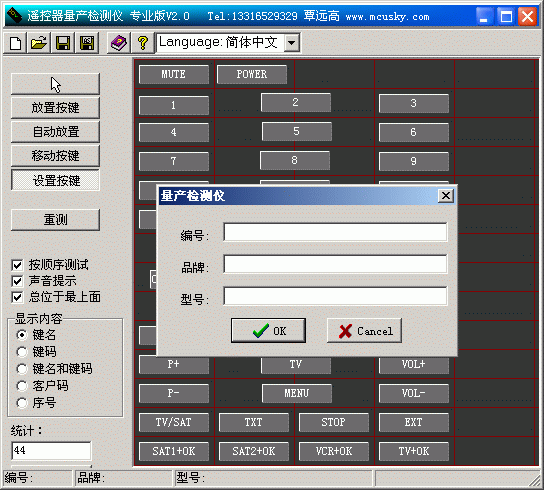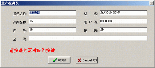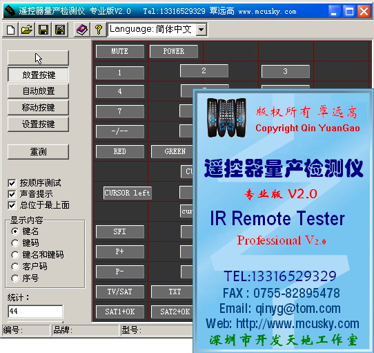 《遥控器量产检测仪》为遥控器的批量生产提供了有效的检测手段,它必须与《红外遥控编码分析仪》一起使用,它的测试思路是:首先用户在软件中设计一个遥控器界面,使它的按键布局与被测遥控器一致,并设置好对应的每个键的编码格式,客户码、键码,设计好的资料可以存盘,以备下次使用,在测试的过程中,每按遥控器一个键,在电脑上对应的按键显示红色,当按完所有的按键显示“PASS!”,并清除所有按键的颜色,继续测试下一个。