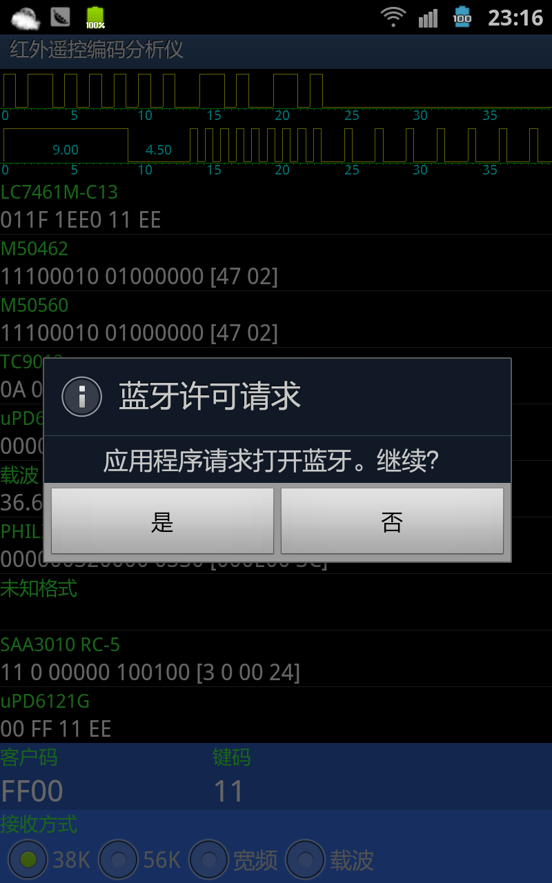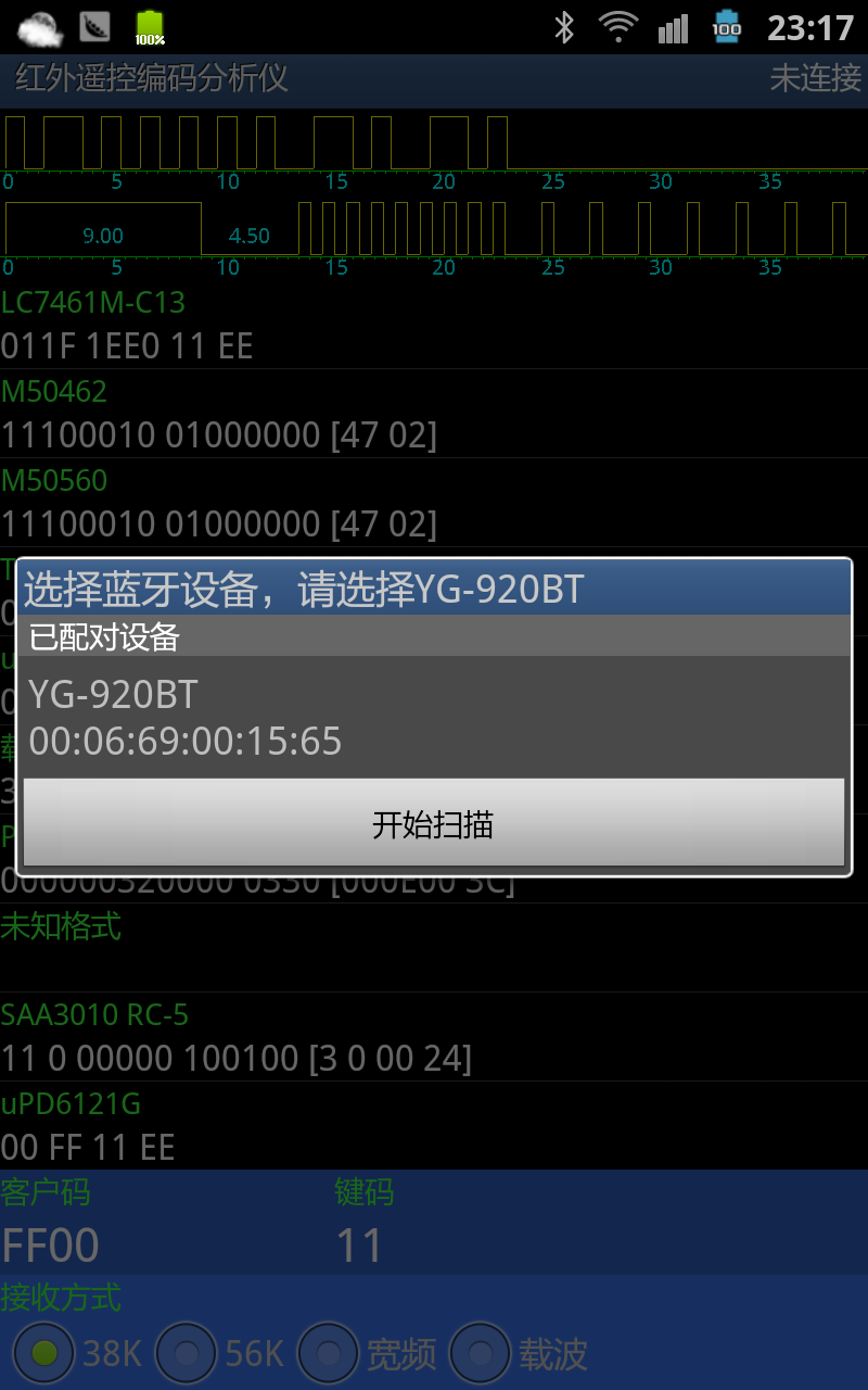 使用《红外遥控编码分析仪-Android版》软件时,可用蓝牙连接,实现便携式应用。