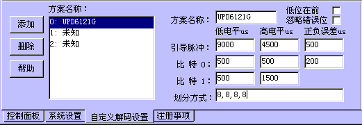大部分遥控器是利用脉宽调制编码的,它们只是脉冲宽度、系统码、用户码、功能码定义方法不一样,称对这部分遥控器,自定义解码方案允许用户自己定义解码方法,以用在未知的遥控器类型上。