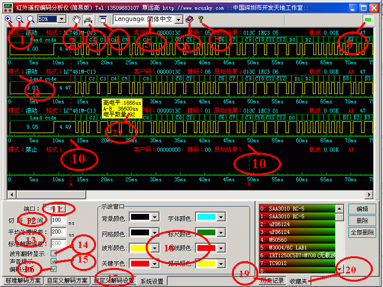 4、可测试脉冲宽度、码串长度、数据位数、引导码、客户码、数据码、重复码等。