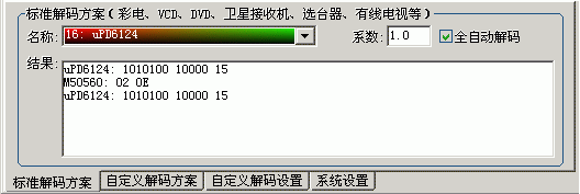 对未知波形自动识别并解开其编码,由于有些编码定时时间相近,所以有时会造成误判,这时可以关闭该功能,而指定解码方案。