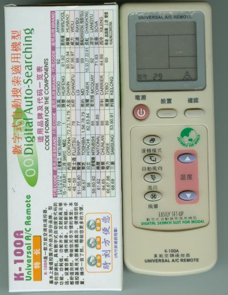 1、K-100A集世界名牌100种不同品牌空调机遥控器功能合一(模式选择、风量选择、手动、自动摆风)等功能,应有尽有。