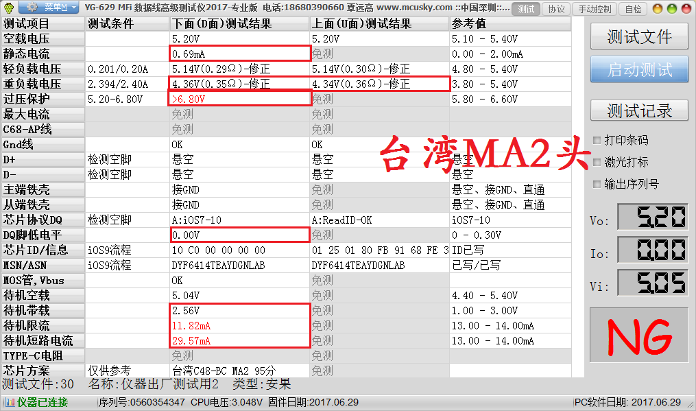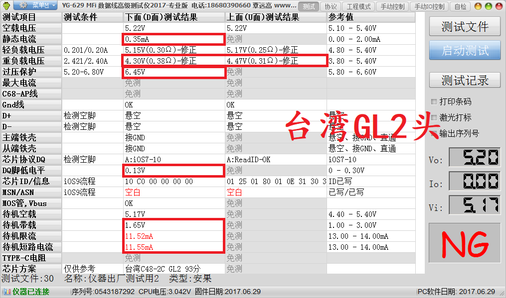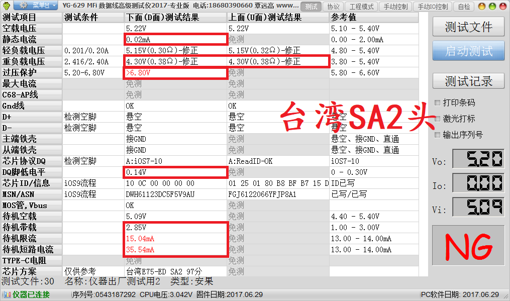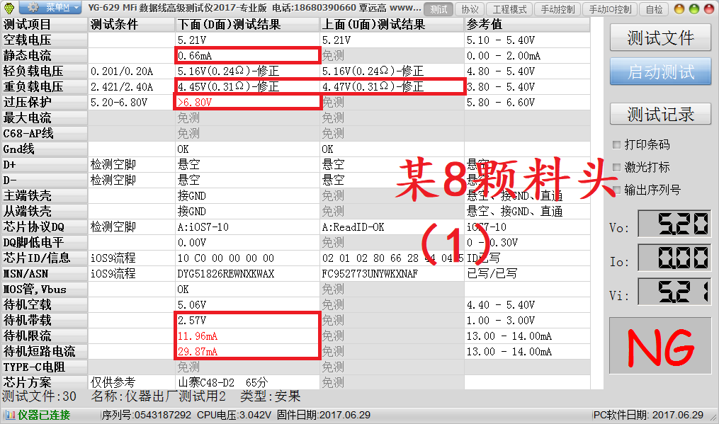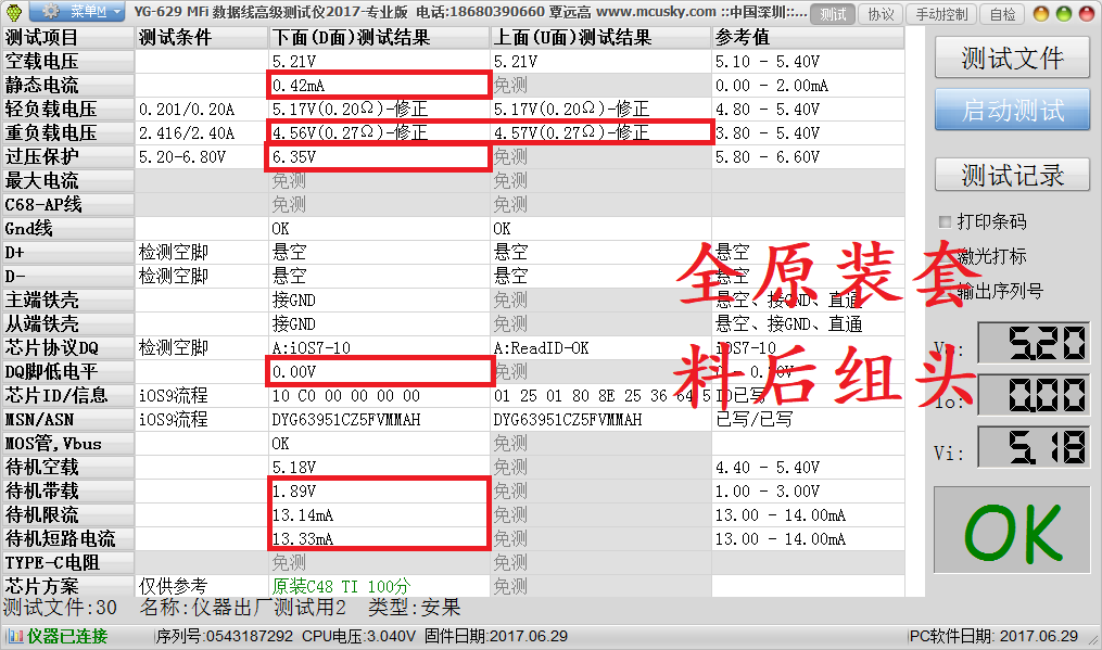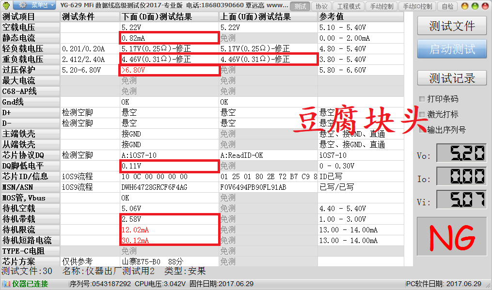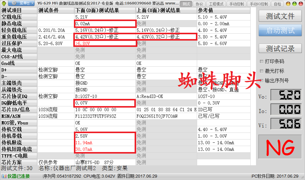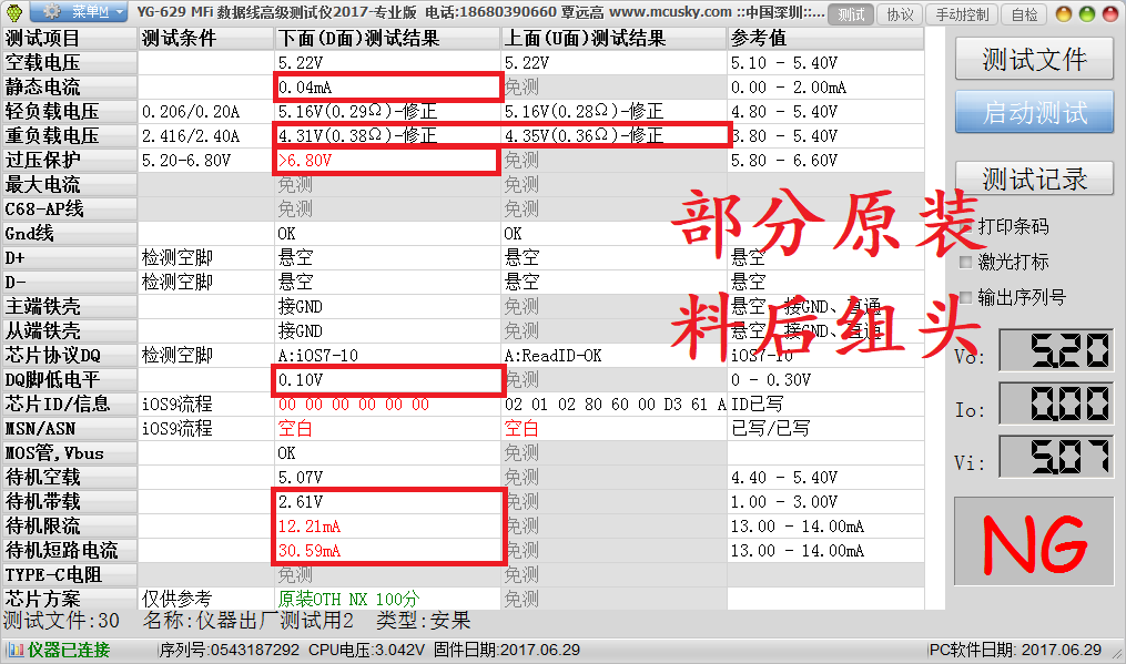 5、待机带载、待机限流、待机短路电流:原装头由MOS管输出,有限流短路保护功能,这些对性能影响不大,记住这些数值可以作为判断原装头的依据。