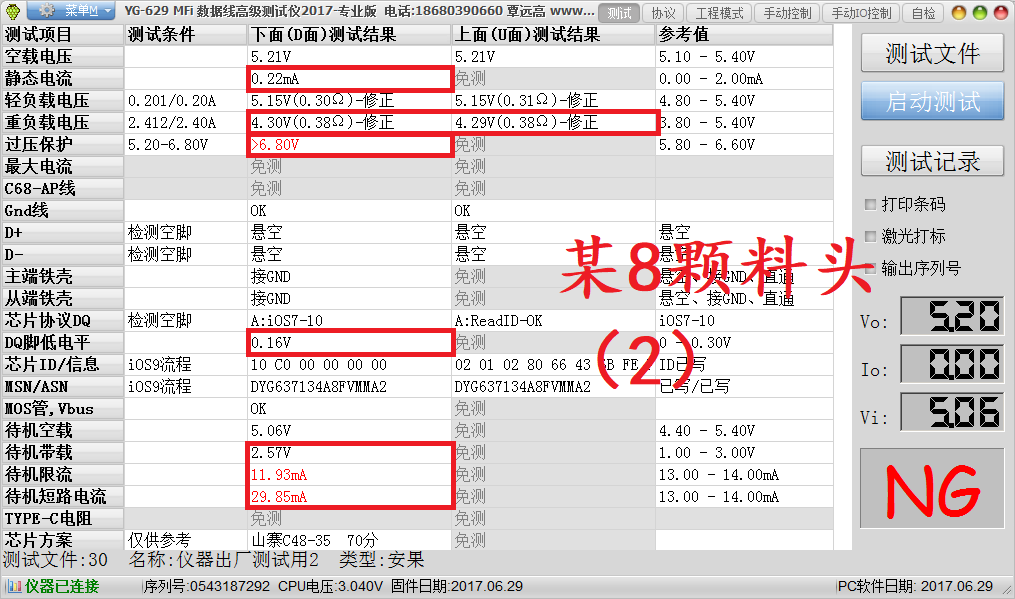2、重负载电压:这个电压越高,代表输出能力越大,MOS管内阻越小,品质越好,原装达4.5V以上,原装头MOS使用NX20P3,是一颗集成电路,集成过压过流保护等,非原装方案多用普通MOS管替代。