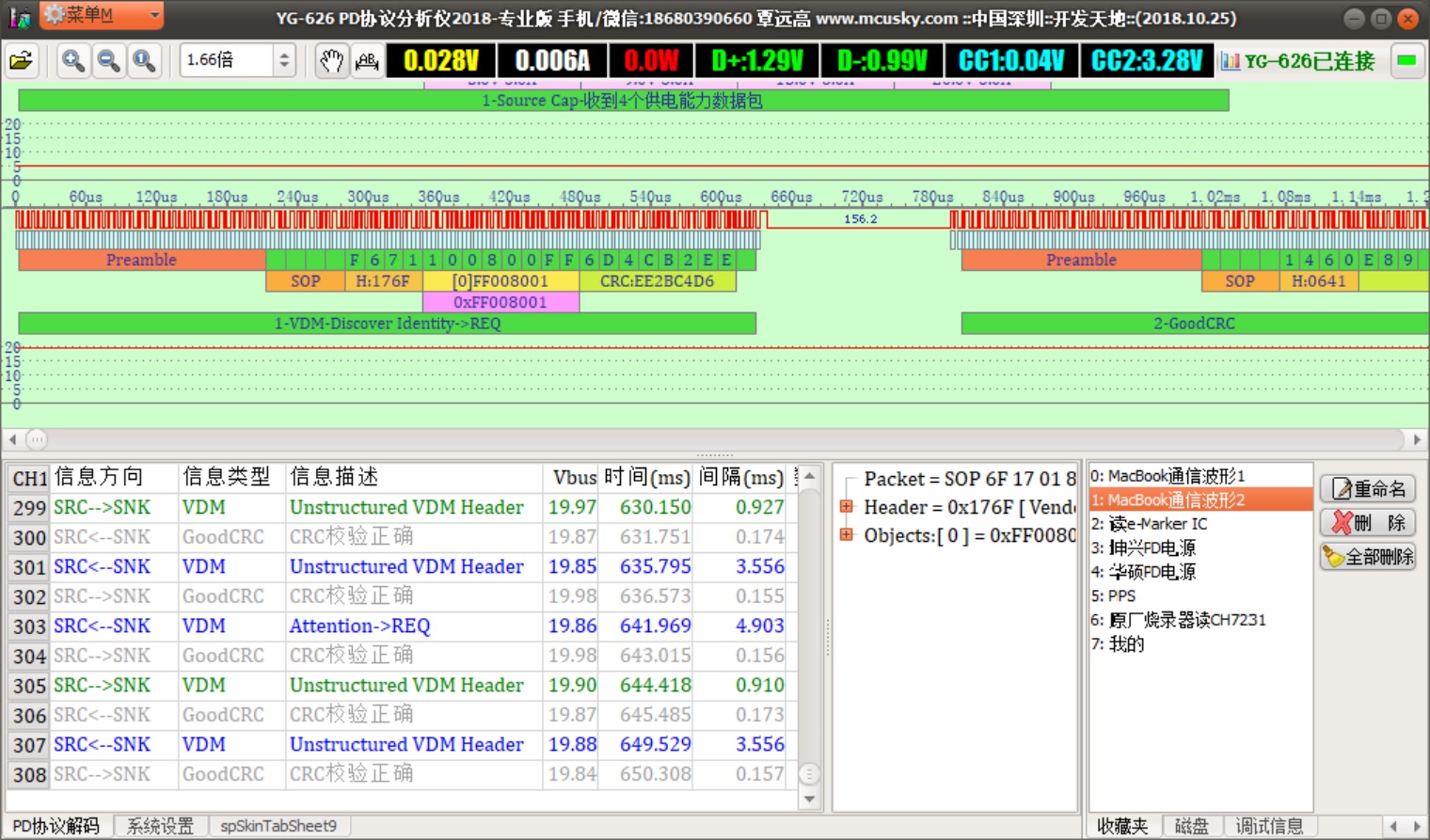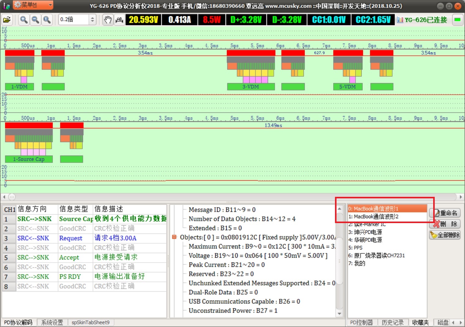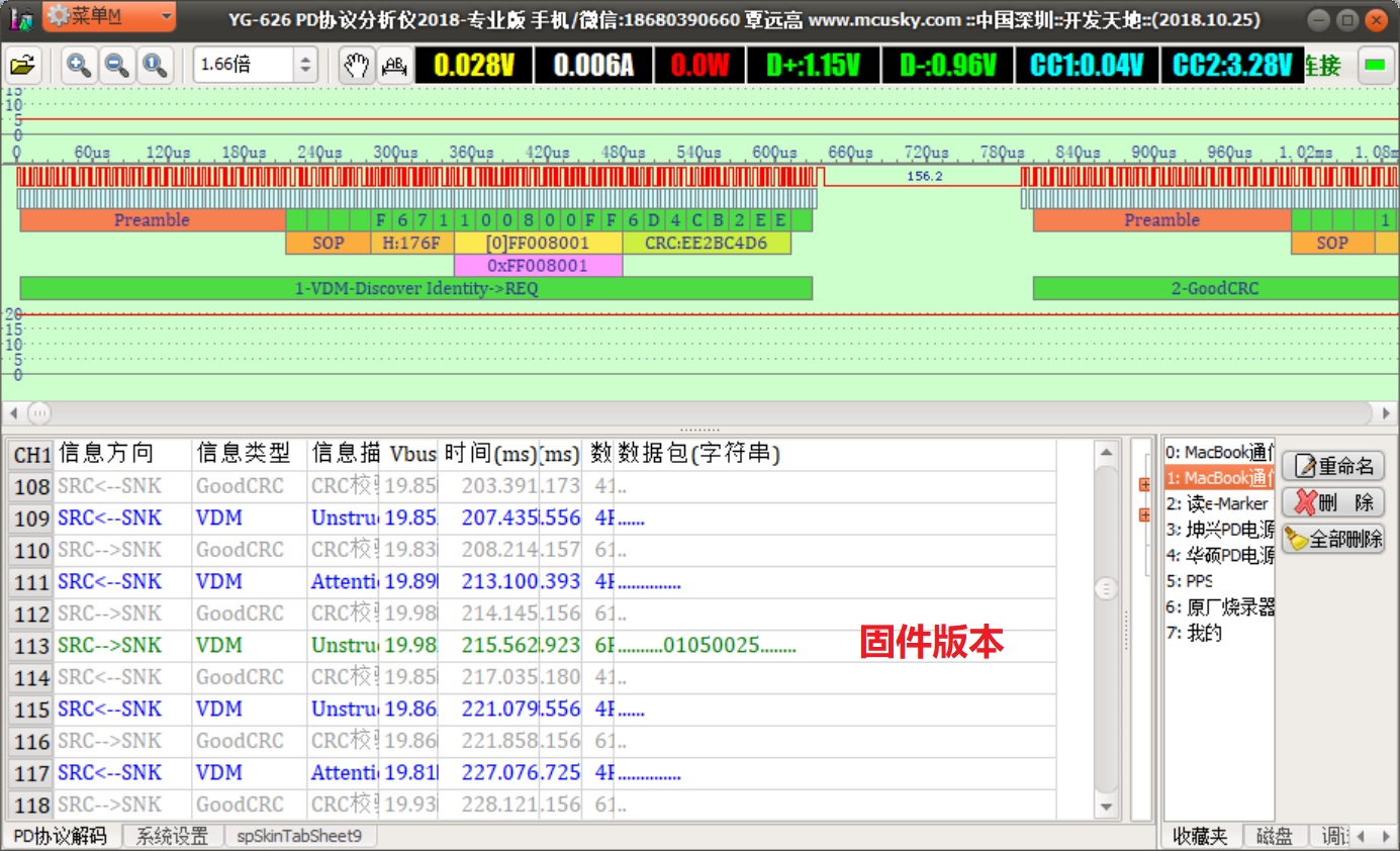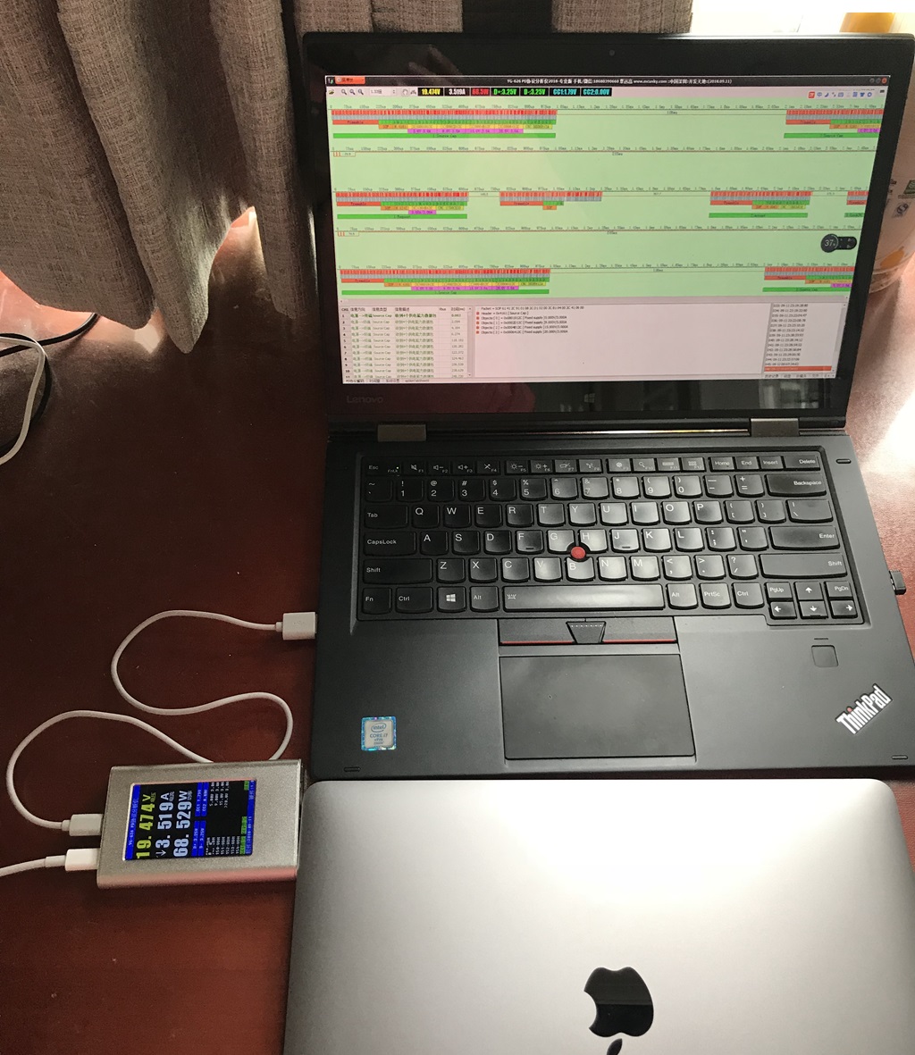 YG-626直接插到MacBook的Type-C充电口,用Micro线连到Windows电脑,在Windows电脑上运行分析仪软件,PD电源通过Type-C线插到YG-626,最后开启PD电源,即可在PC上抓取到PD通信的波形,在仪器上也会显示电压和电流。