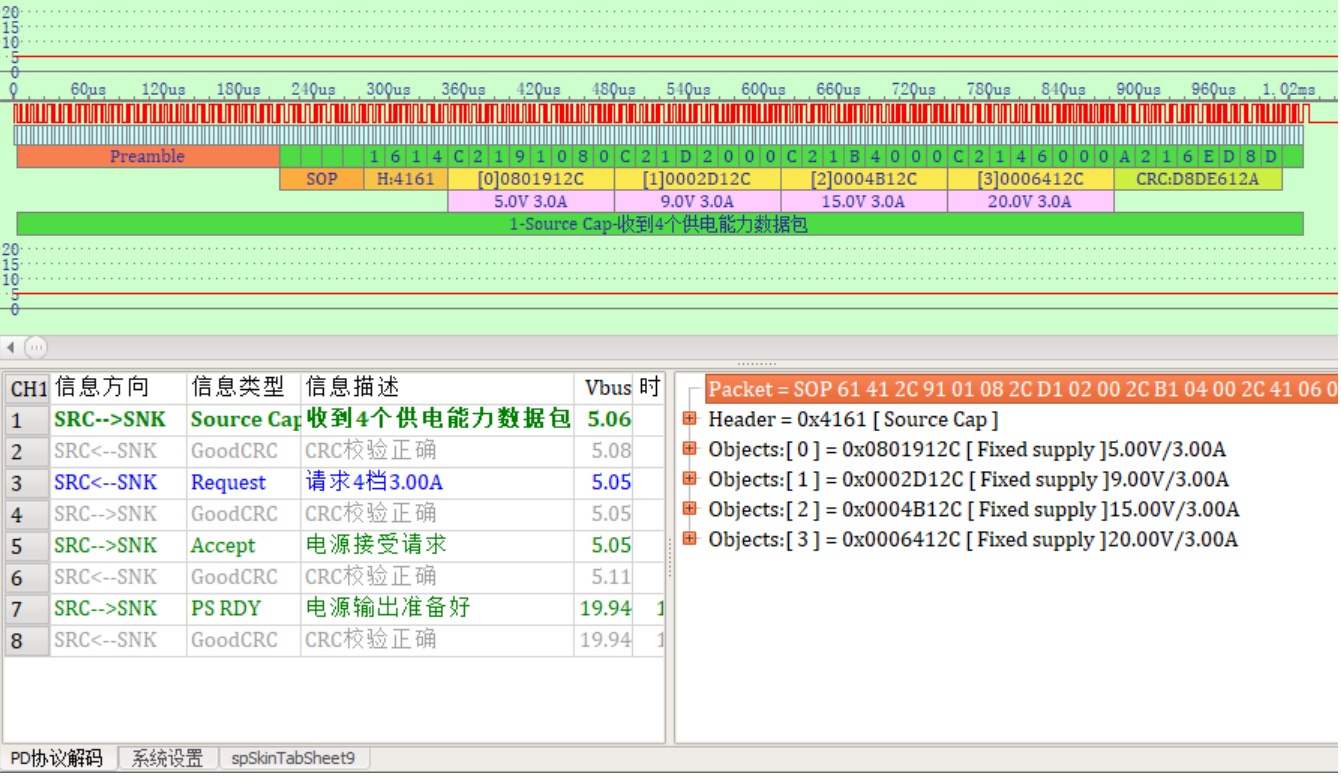 第一次通信如下图,PD电源上电后会广播供电能力包,这个电源最高功率60W,可以输出4种电压,MacBook收到后回复GoodCRC消息,接着请求第4档20V/3A输出,电源收到后发出“接受请求”消息,并把电源输出调整到20V,大约0.16秒后输出达到要求,电源发出“准备好”消息。