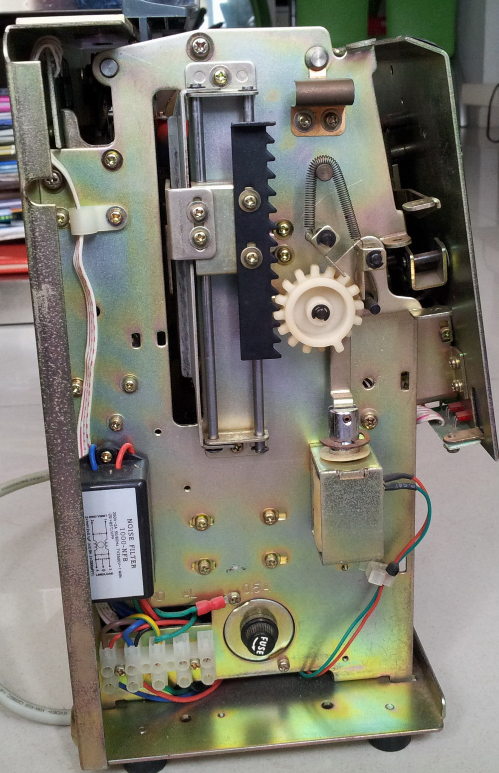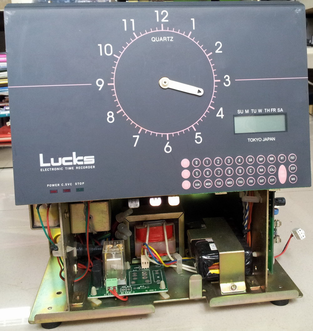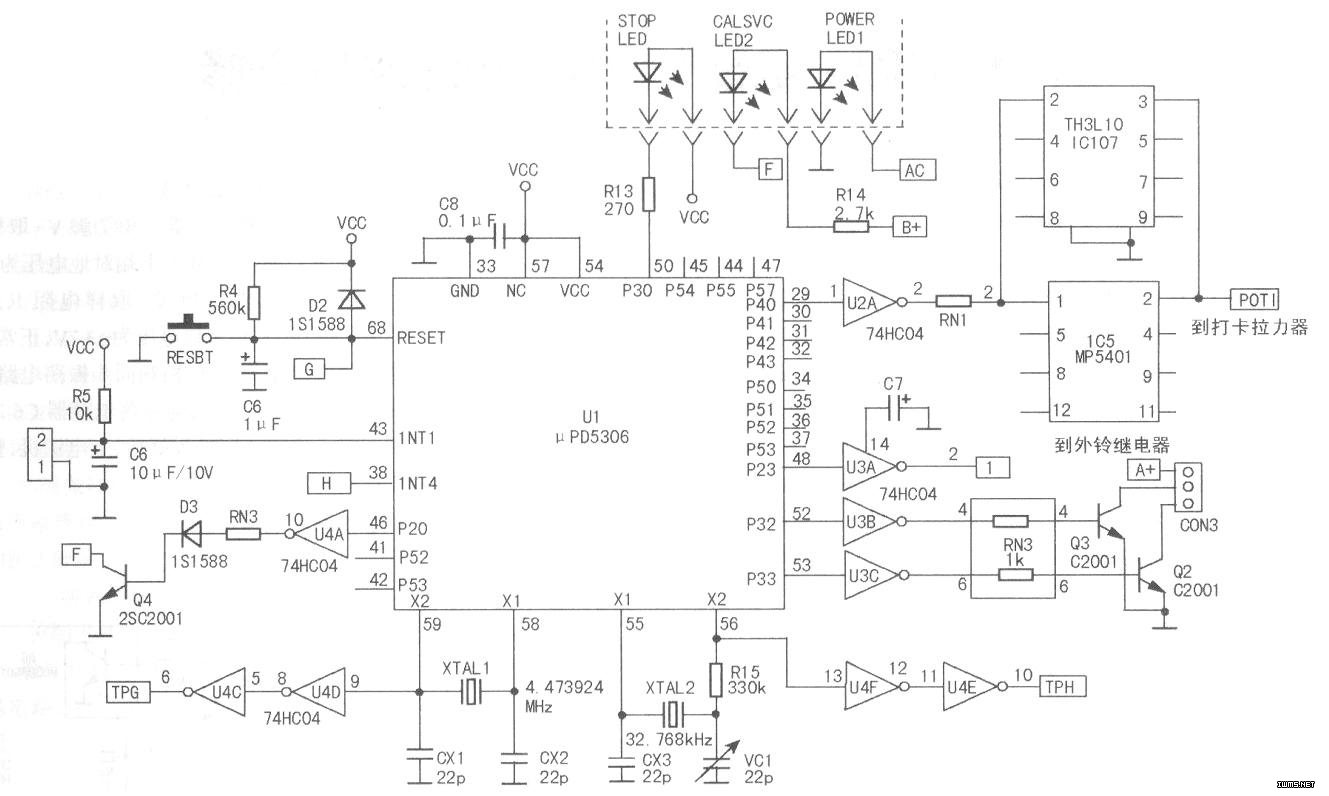 例如打卡功能:当有卡纸插入的时候,触到打卡开关(MIC RO.SW),使其接通,从而使CPU(43)脚经Rl6接地,变为低 电平,U1识别到有卡插入,便从(29)脚输出一个低电脉冲 送至U2A(1)脚,但U2A(2)脚反相输出一个高电平脉冲, 经RN1排阻限流后,输入IC5(1)脚(IC8在实际电路中未装, 与IC5并联,装其中一只便可),IC5(2)脚输出低电压脉冲使 打卡拉力器吸通一次,打卡一次。其他各个功能原理基本相同 ,在此不再赘述(图2中只画出了打卡部分电路)。