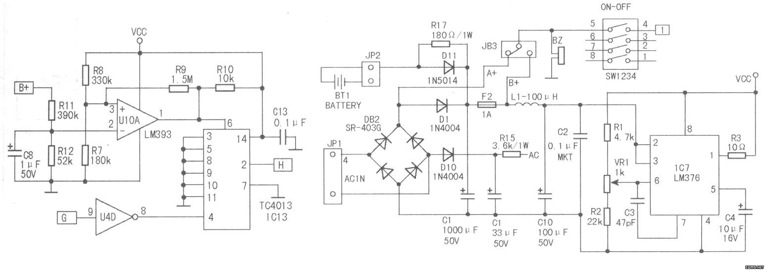 U1(38)脚为低电压保护端,即“PD”功能保护控制脚。 正常工作时,该脚输入为高电压。该功能是为了防止在无交流 电的情况下,利用电池供电时,不将电池电量放尽,从而保存 CPU内部设定的资料。如下左图所示,电池电压一路经R11与 Rl2分压,送往供电电尼比较器U1OA(LM393)(2)脚,作为 识别检测电压。
