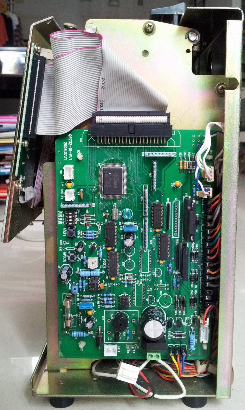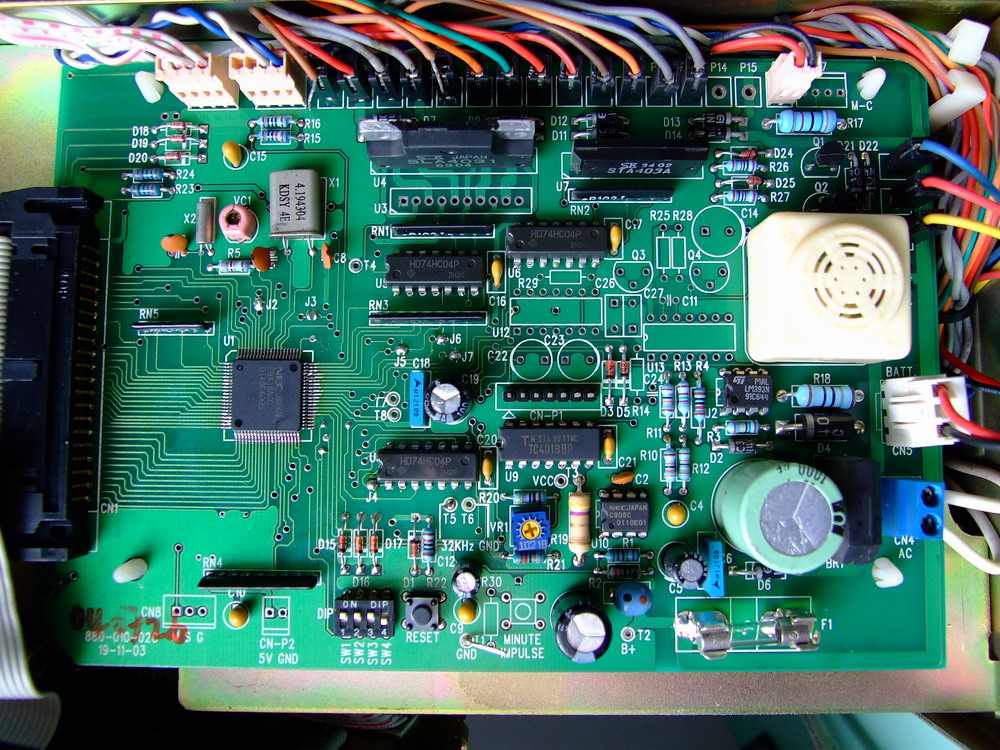 U1(16)脚为维修信号输出端:正常的时候该脚保持为 离电压,但当CPU内部资料杂乱,或4.6V供电电压过低和跳格 功能(只限于QR733)不正常时,(46)脚均会变为低电压,由 U4A反相后由(10)脚输出高电,经限流电阻RN3后,再由D3 隔离,使Q4导通,点亮钟面线路板上的鲱修红灯LED2。LED2 如果发亮,表明机子已有故障,需要维修。