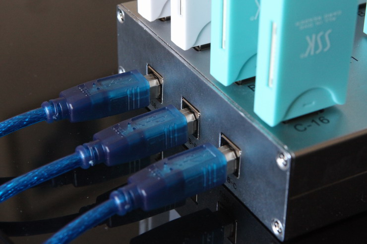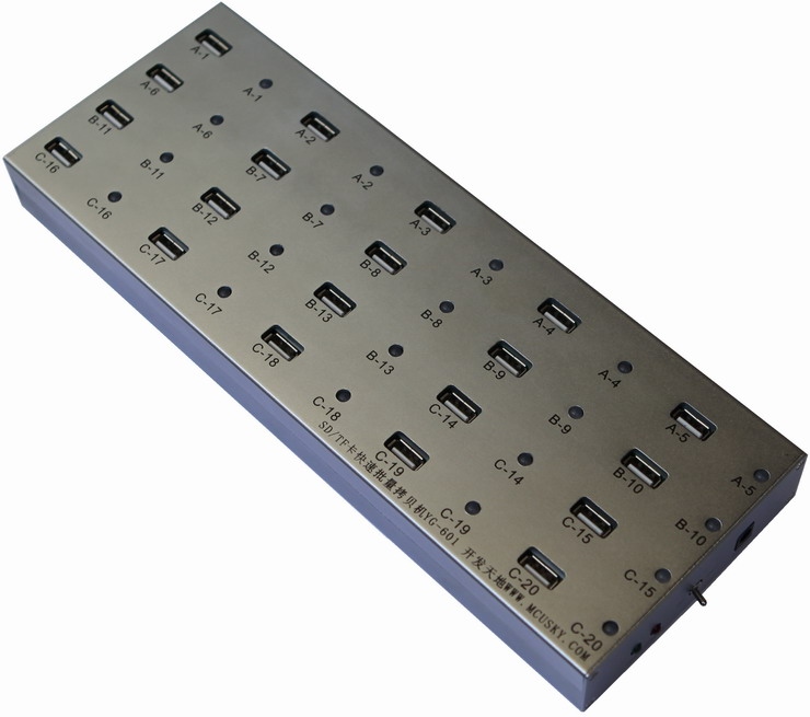 本机提供20个USB 2.0接口,可以外插20个读卡器,每个口有独立的指示灯,有外接电源供电,连接到电脑USB口,由电脑软件控制拷贝过程,最多支持20张卡同时拷贝,适用于工厂对大批量SD卡或其他存储卡进行资料拷贝,比如MP3、媒体播放器、