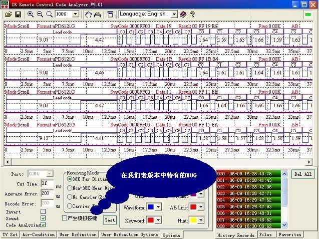 被盗版的是早期版本,虽然他宣称的是红外线遥控编码分析仪专业版V9.01版,实为直接采用我们的V4.0版软件改头换面,功能远不如我们现在的V6.0版,