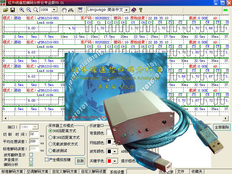 <红外遥控编码分析仪>目前最高版本为专业版V6.0,硬件上采用国外先进的已停产的IC(当然我们备有库存),无法解密仿冒,软件上采用了多项自主研发的加密措拖。