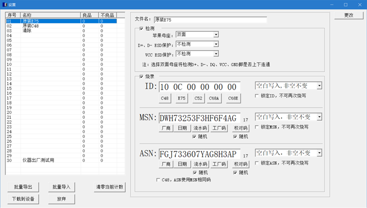 目前支持芯片,NXP公司的A0005、A0006(iPhone8方案)、Ti公司的BQ2025烧写,C100用的ATCPZ001,C94用的AS3616,自动识别型号。