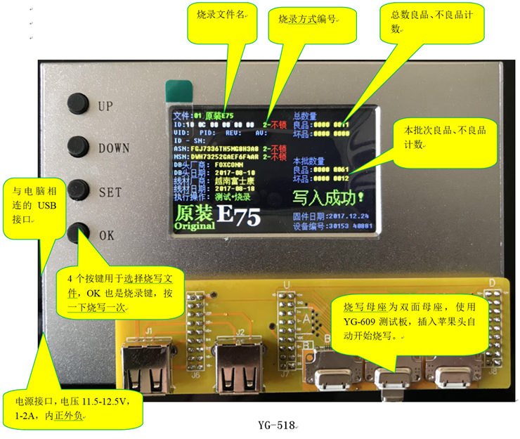 运行PC软件YG518.EXE,用USB线连接烧录器到电脑,软件会提示更新固件,选择确定更新就可以。如果没有提示拔下USB再插一次,如果已经是最新固件,也不会提示更新。