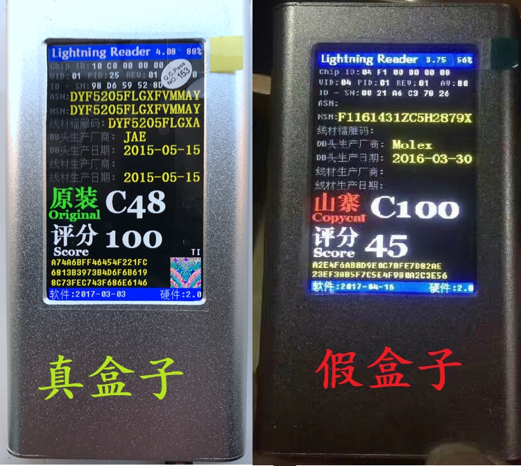 苹果数据线内含认证芯片,原则上生产苹果数据线是要经过苹果授权的,但实际情况是认证芯片已经被破解,市面上有很多山寨方案,山寨方案存在很多问题,比如稳定性很差、兼容性不好等等,在不拆开线材的情况下很难识别真假,为此我们开发本产品用于识别数据线内部所使用的芯片方案,通过DNA数据库比对技术,准确识别芯片方案,坚持公平公证原则,不会把某些特定的山寨方案识别为原装方案。