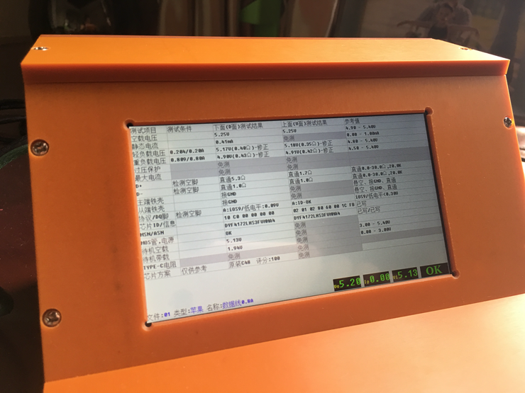 基于成熟的YG-609升级,不惜成本打造一款高端全能测试仪,增加IPS大屏显示(颜色和视角都很好)、静态电流检测、IC通信脚驱动能力检测,设计成内置12V3A开关电源,USB有隔离IC,定制电木外壳,三芯电源线,背后有固定孔可打螺丝固定于桌面,支持苹果或MICRO数据线、充电线、充电器、充电宝、苹果单头、Type-C转Lightning的测试。