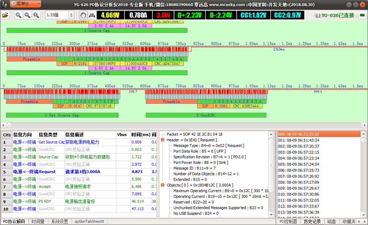 2、抓取PD协议波形和数据在电脑上显示,图形标注,显示详细协议数据,从底层协议到上层协议一目了然。