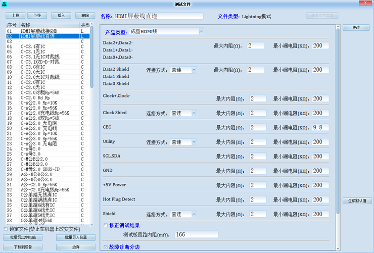 11、 可检测线材通断、错线、内阻、漏电阻(绝缘电阻)并根据设定参考值判定是否合格。