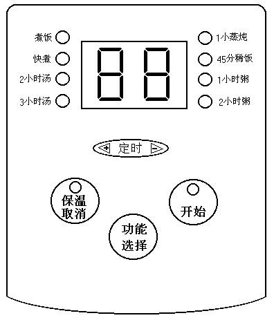 a)待机状态下按功能选择键,选中2小时粥,2小时粥指示灯亮,开始指示灯闪烁,按下开始键,(开始灯亮)进入2小时粥功能,屏幕显示“2”,此时开始计时;