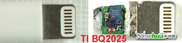 ChipWorks称,苹果Lightning电缆采用四个嵌入式处理器,加上一些被动设备,关键部件是标记为“BQ2025”和“NXP's NX20P3 IC”的德州仪器集成电路。BQ2025并未出现在德州仪器公布的上市产品的数据库中,Chipworks 猜测 BQ2025 也内置了同样的安全技术。ChipWorks表示,芯片上包括了大约有64或128位的存储容量的EPROM(可擦可编程只读存储器),芯片还包括大型驱动电晶体、相当多的模拟电路和大量电容。